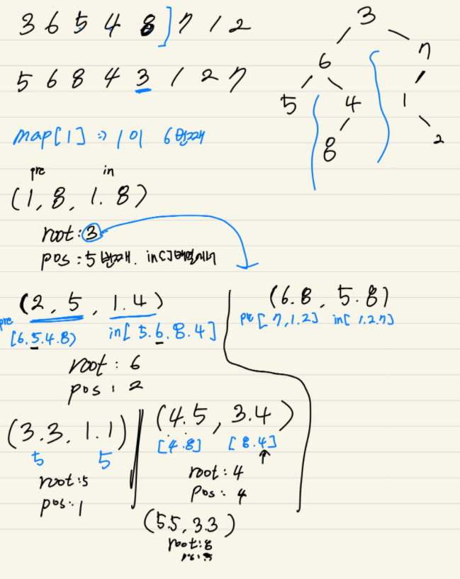 root : 3, pos: 5가 되고, 3번을 기준으로 왼쪽 서브트리, 오른쪽 서브트리로 나눠서 재귀를 사용한다.
