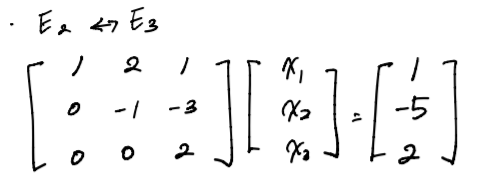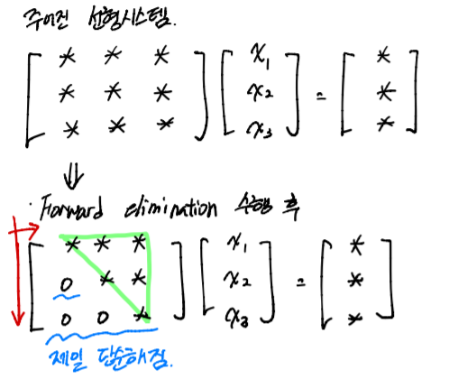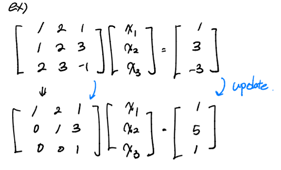 주어진 선형시스템을 아래로 갈수록 더 단순한 형태의 선형방정식을 가지도록 변형 - back substiution (후방대입법)