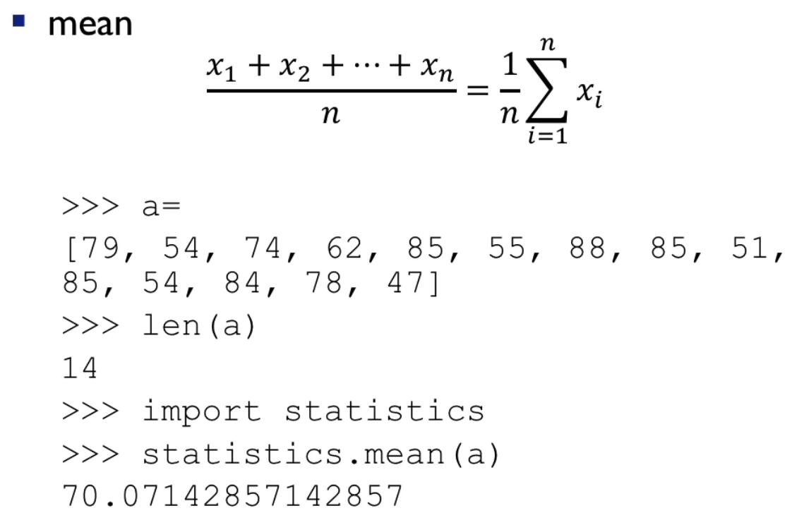 statistics 모듈 : mean, median 등의 함수가 들어있는 파이썬 모듈 (추가적인 설치 필요없음)