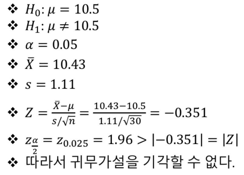 새로운 주장이 없었던 일이 됨- \(H_{0} \) : \(\mu = \mu_{0} \) (새로운 평균(표본평균)은 기존 평균과 같다.)