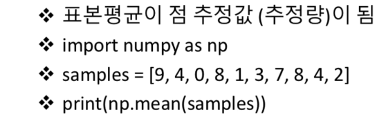 - 모수를 추정하기 위해 표본을 선택하여 표본 평균이나 표본 분산 등을 계산