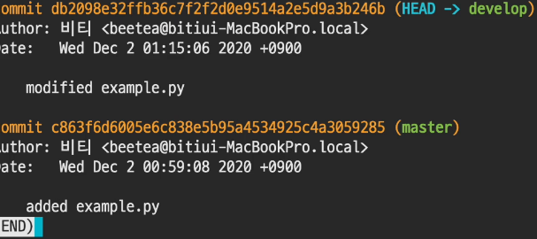 git commit -m "added example.py" # develop 브랜치에서 커밋을 하게 됨